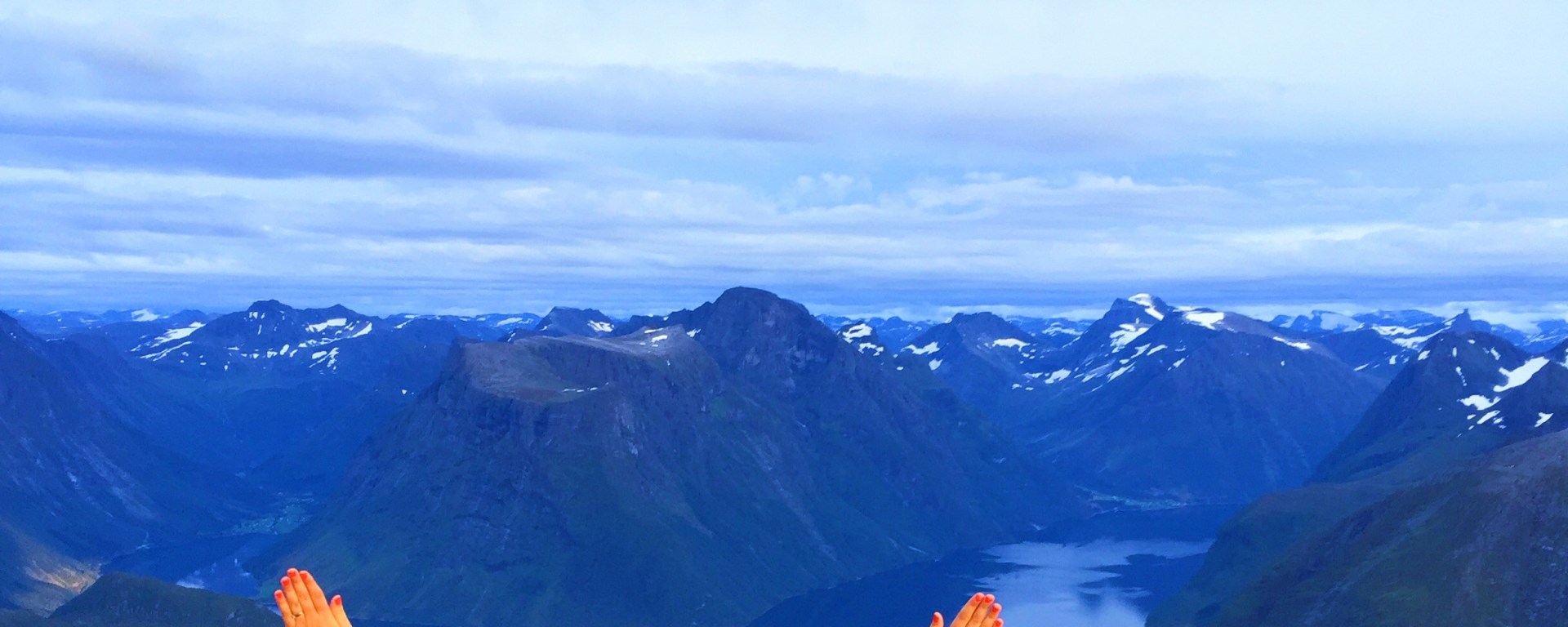 Vel oppe får man en fantastisk utsikt både mot Hjørundfjorden og Sunnmørsalpene.// Fantastic views from the top, you can see Hjørundfjorden and the Sunnmøre alps.
