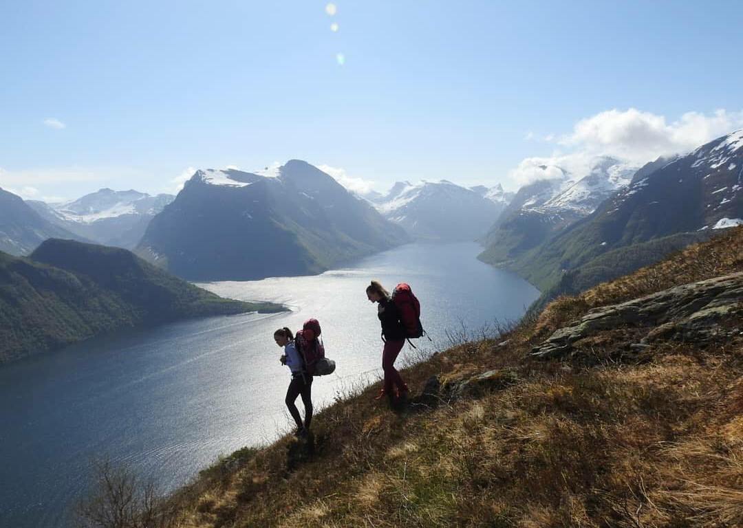 Teltet er komt opp, med nydelig utsikt over Hjørundfjorden fra telt åpningen.