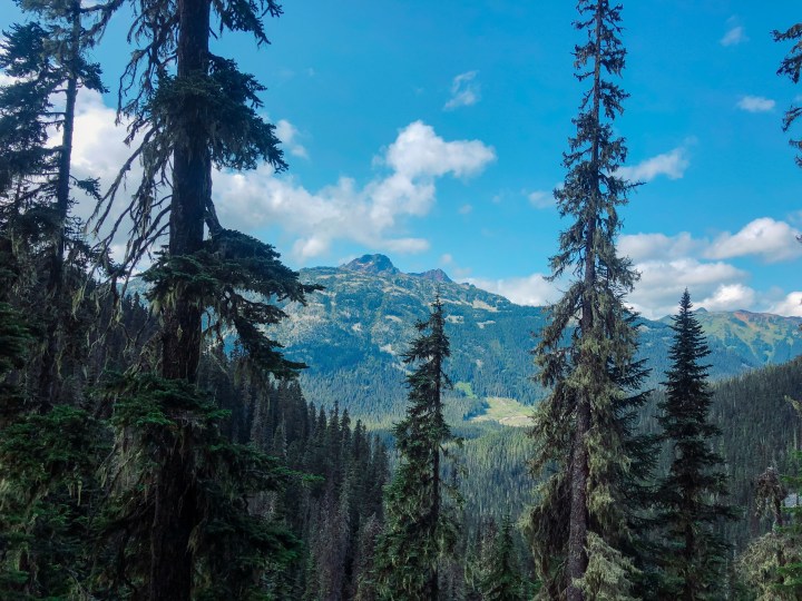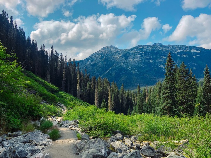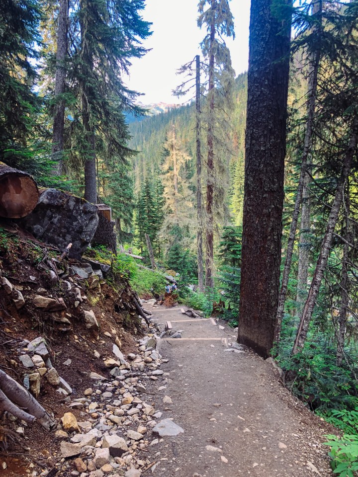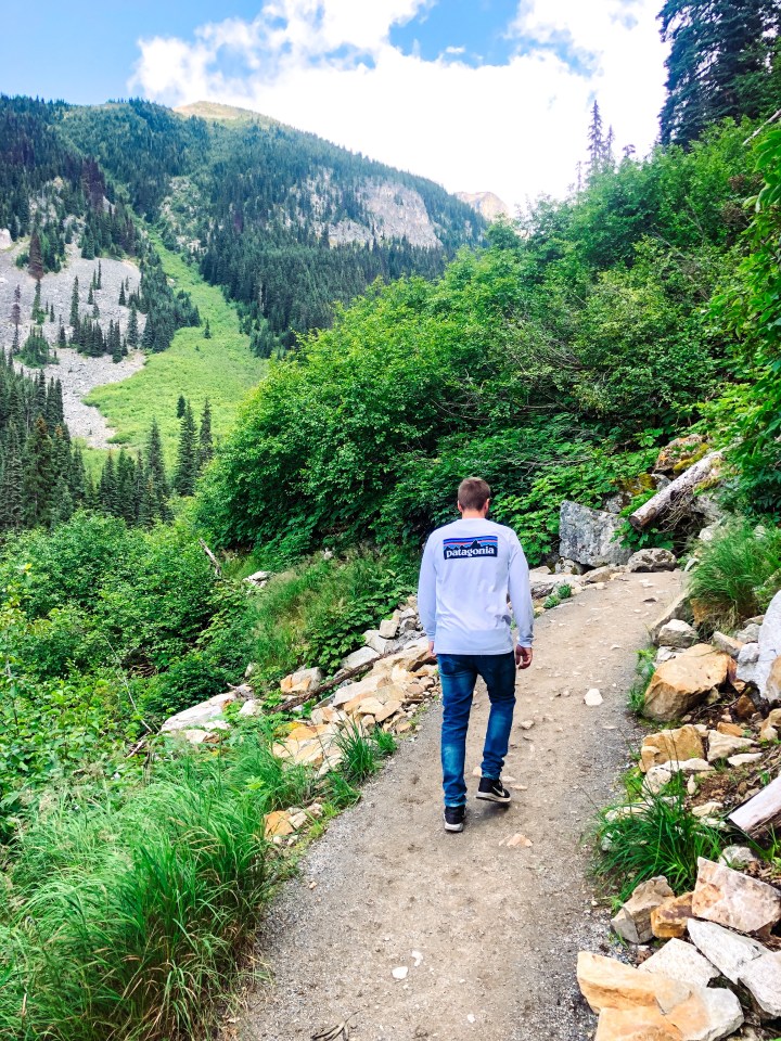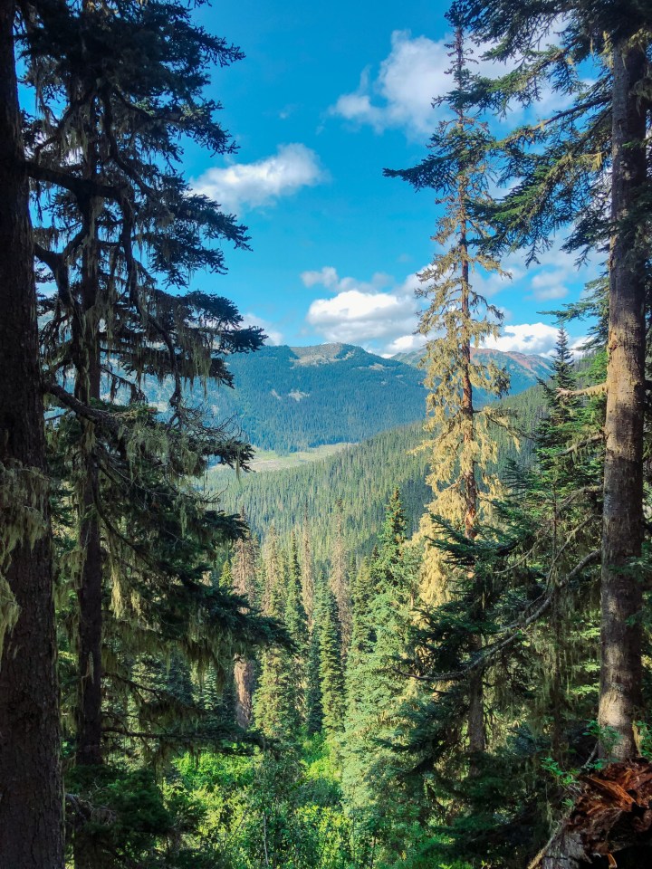 Videre fortsetter stien oppover, gjennom litt skog før du kommer opp til en åpning og får utsikt over dalen i retning der du kom fra. Det er mye bjørn i dette området, så vi hadde med bjørnespray og en bjørne bjelle men heldigvis møtte vi ingen.