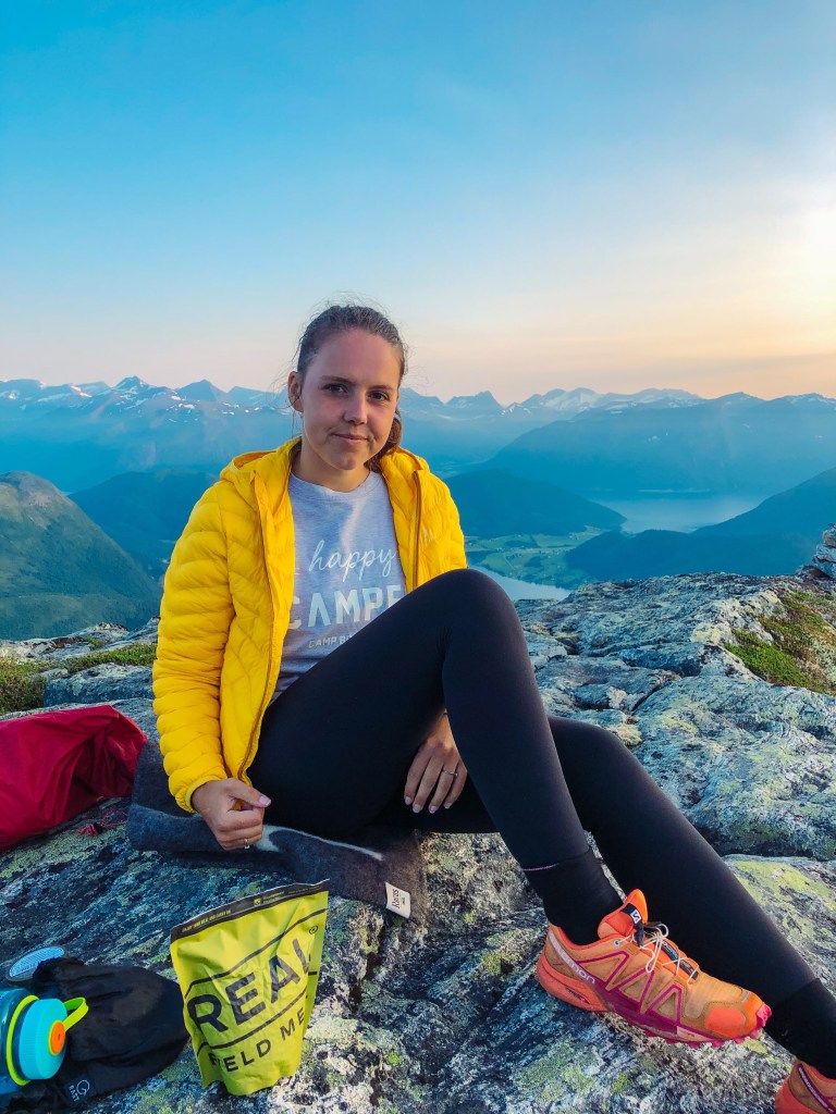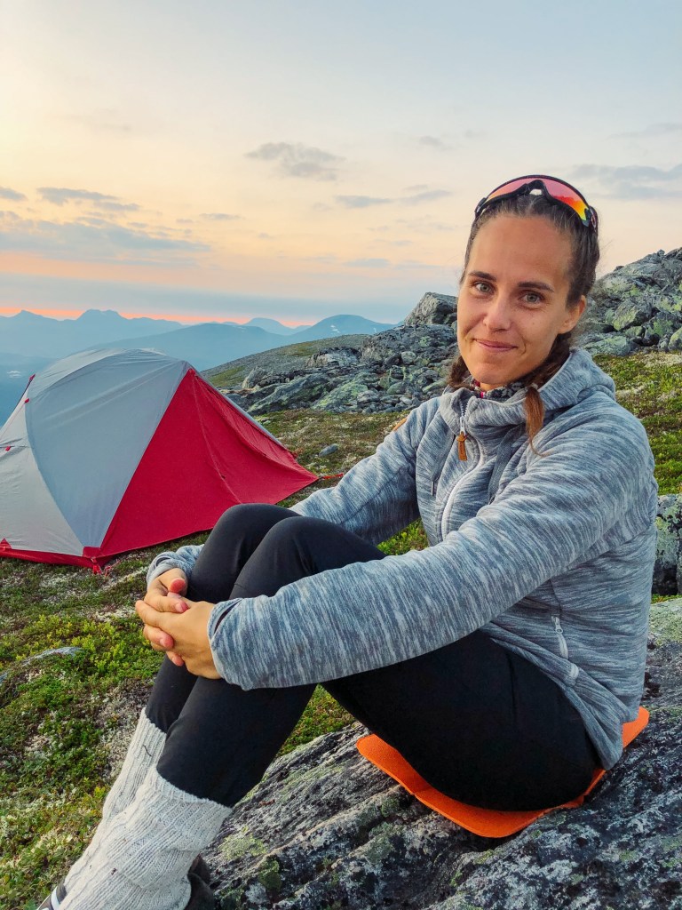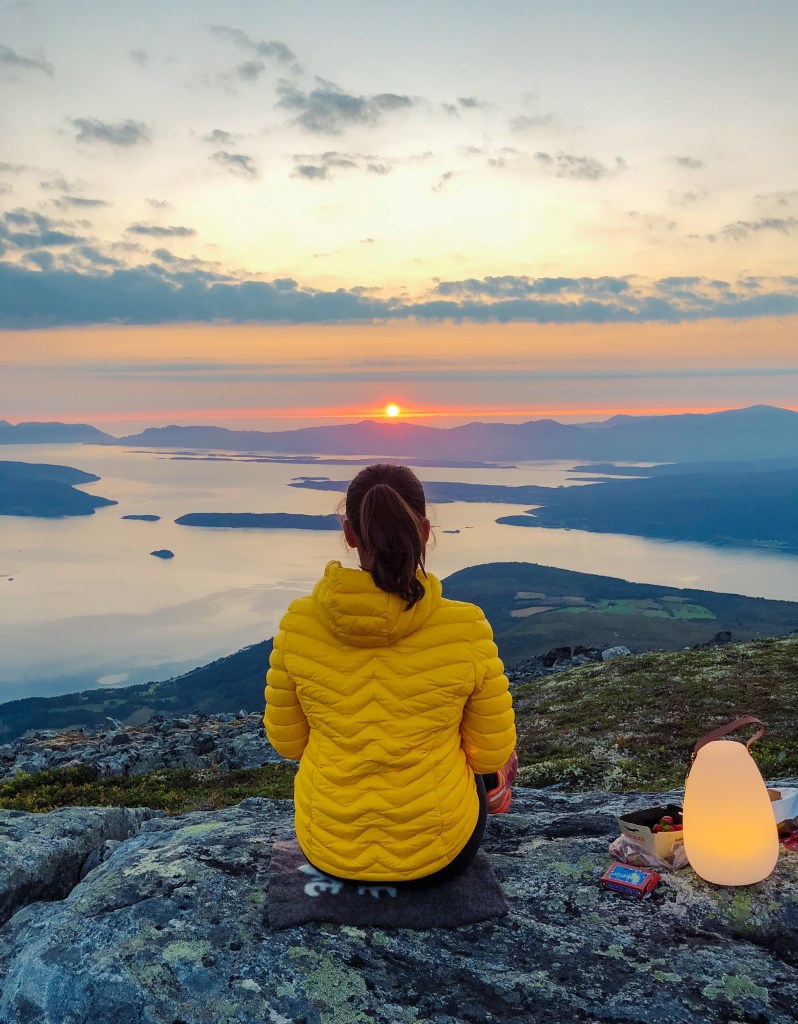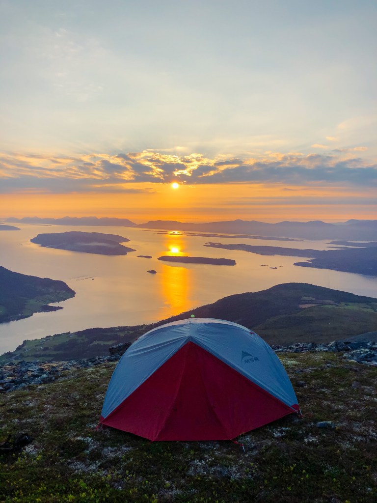 Men vi har med telt, og finner en fin teltplass med utsikt mot solnedgangen.