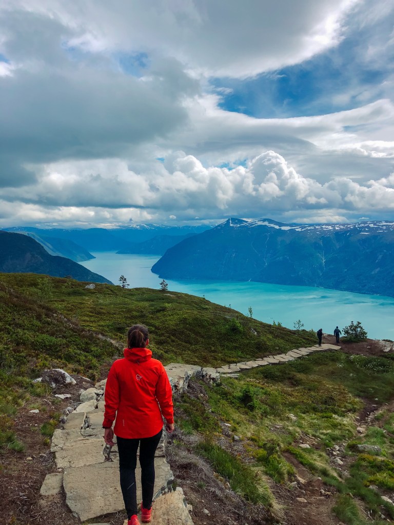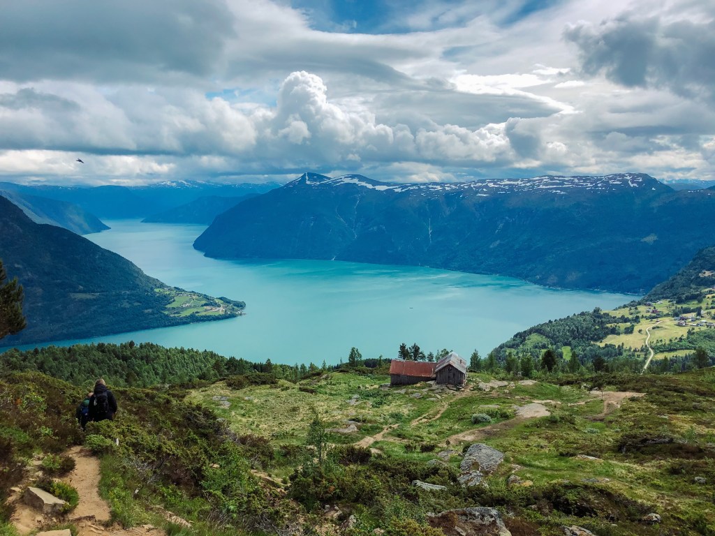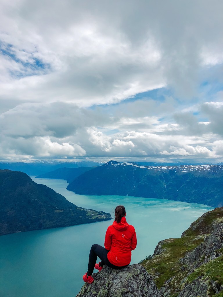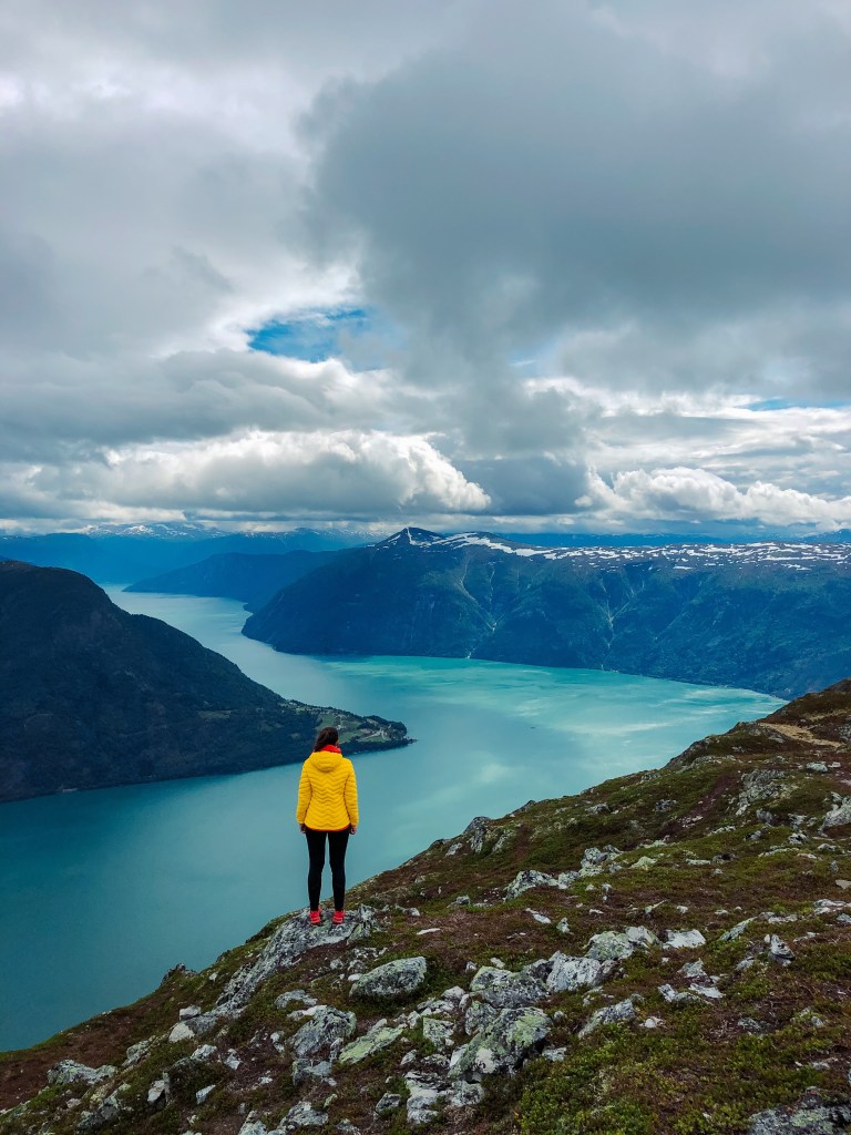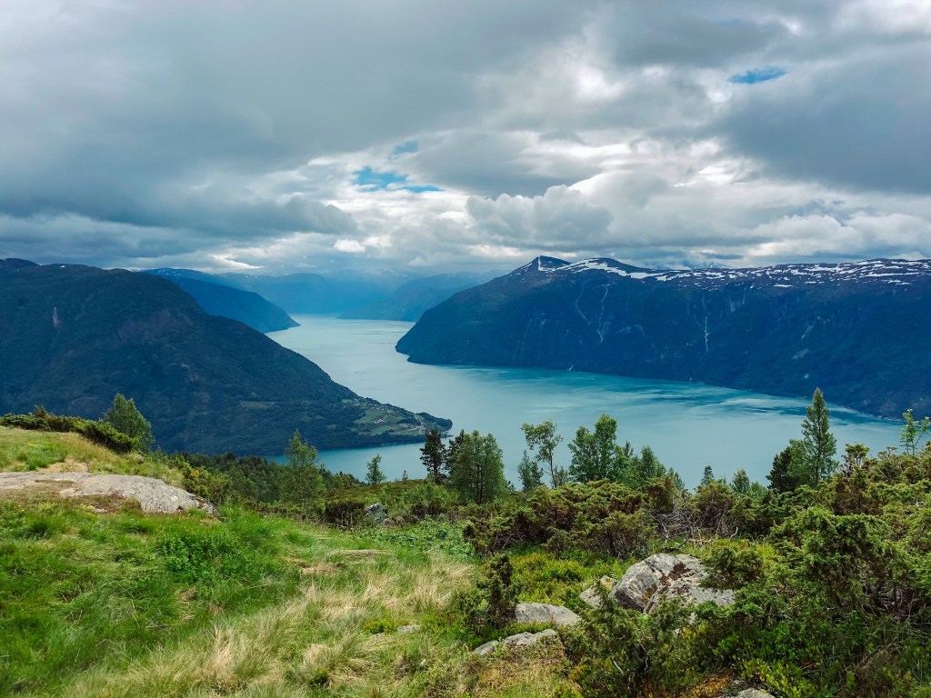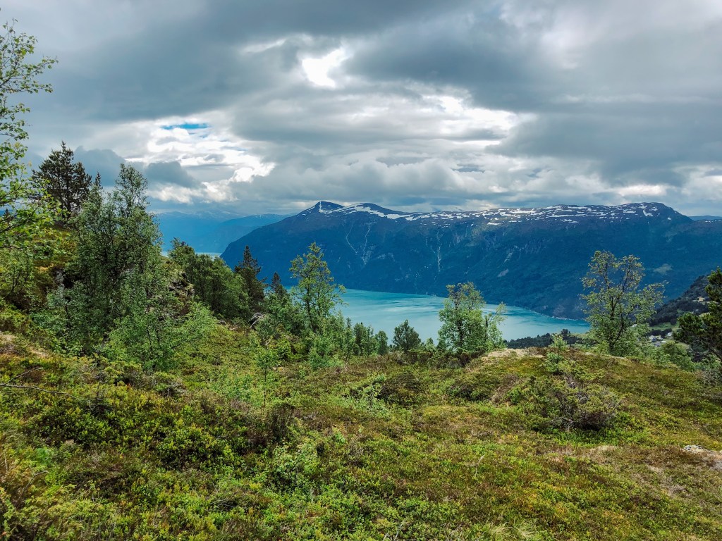 Den aller fineste utsikten finner du på øst sida av toppen. Høyt over Lustrafjorden og utsikt over til Ornes.