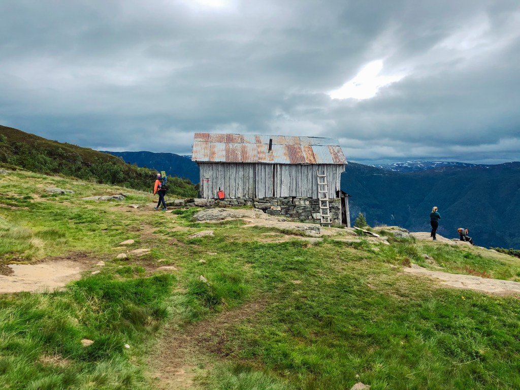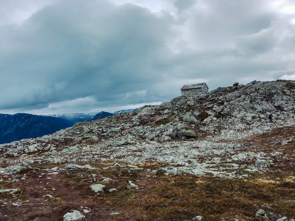 Nord på toppen er en gapahuk i stein, fra den har du panoramautsikt over Lustrafjorden.