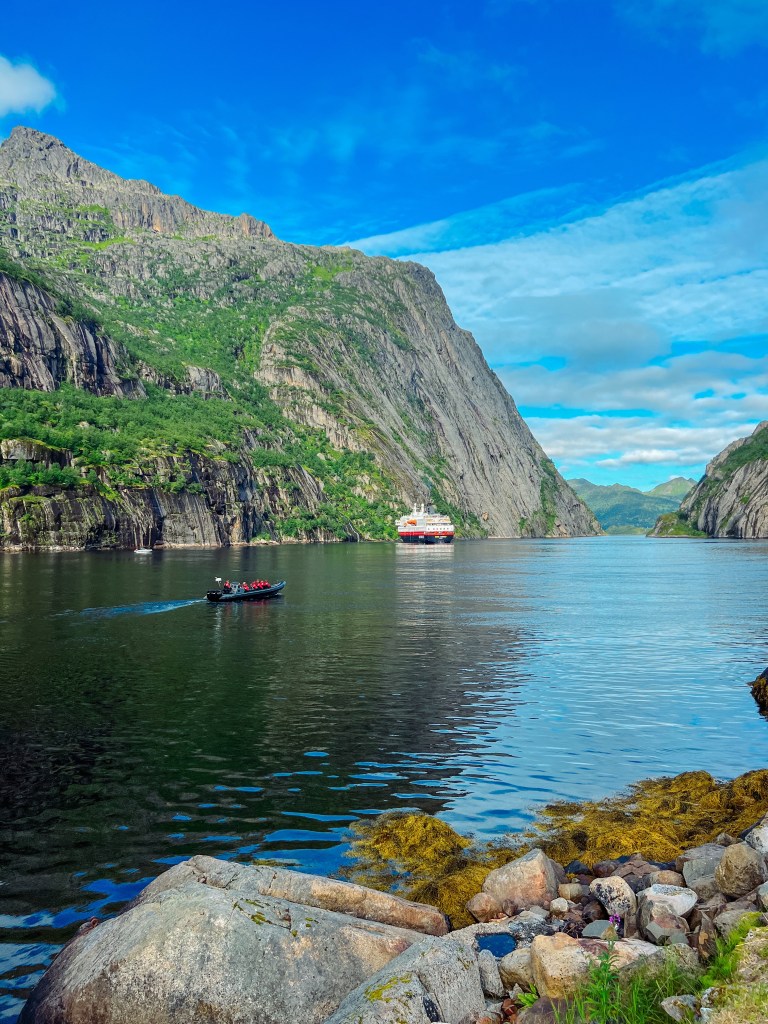 Rib båten slapp oss av på kaia i Trollfjorden. Hurtigruta var også innom.