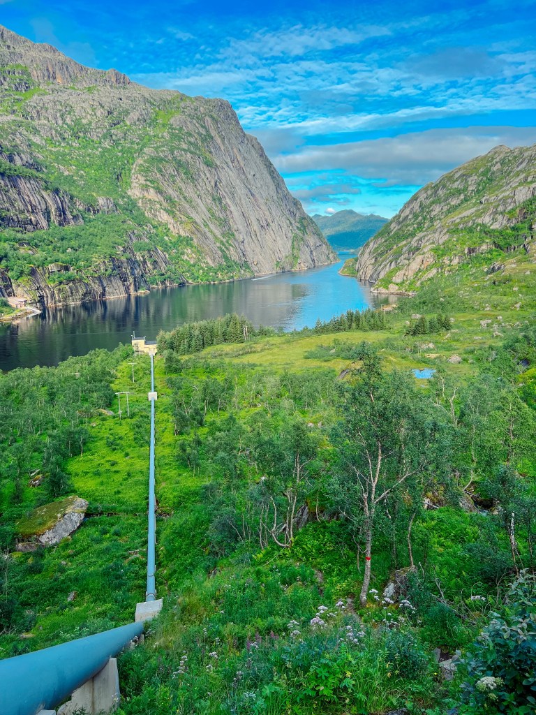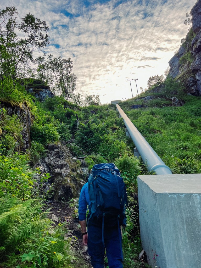 Fra kaia er det ca 2,5 kilometer å gå til hytta. Gå rundt og bak kraftstasjonen og følg rørgata det første stykket.