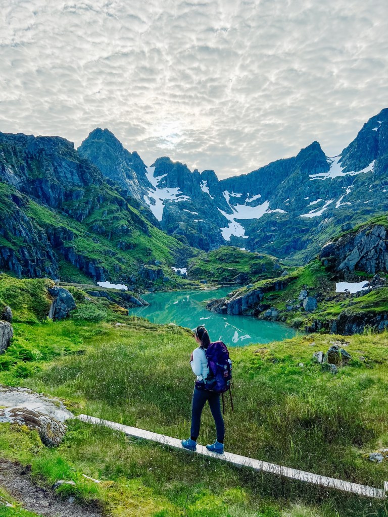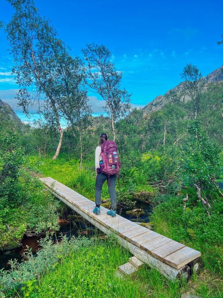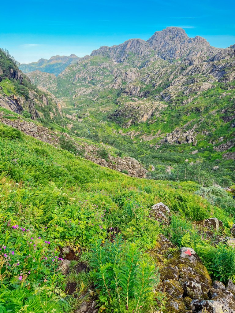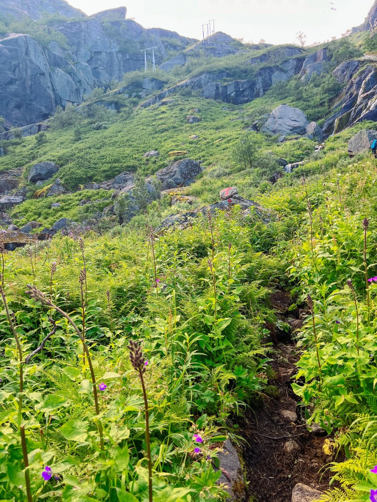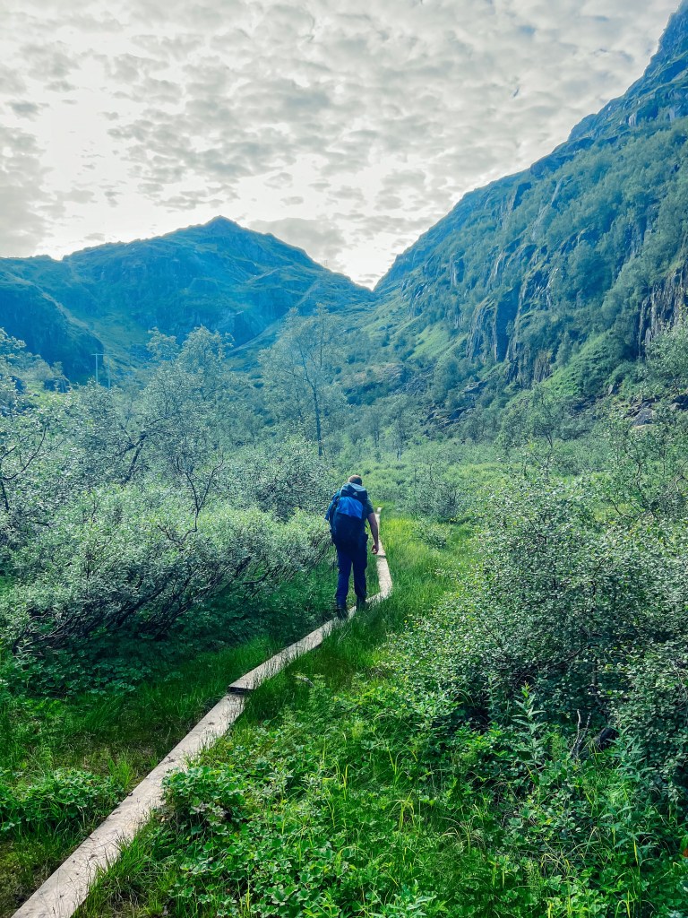 Stien er merket. Etter første stigningen snudde vi oss å så tilbake til Trollfjorden. Videre går det på sti og klopper innover Isvassdalen.