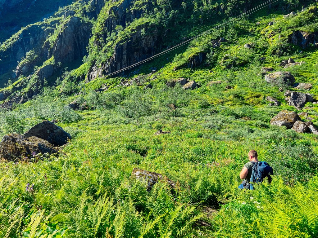 Innerst i Isvassdalen begynner en stigning på ca 300 høydemeter i veldig tett vegetasjon. Det nådde oss nesten opp til skuldrene enkelte steder, så vi kalte det jungelvandring.