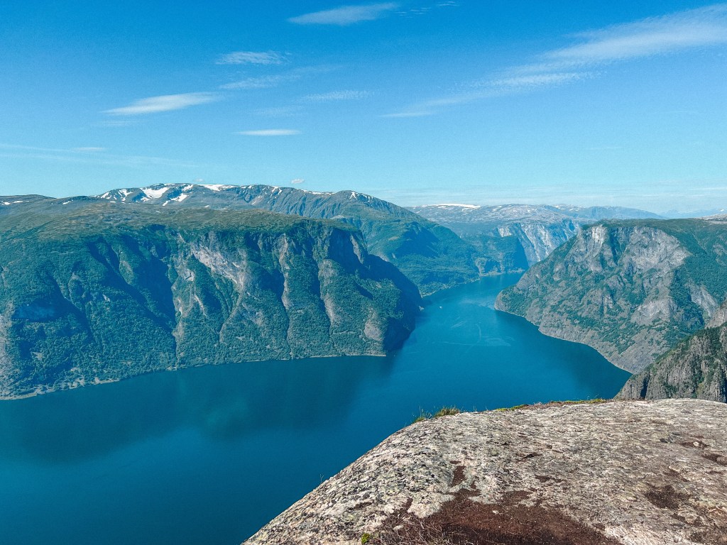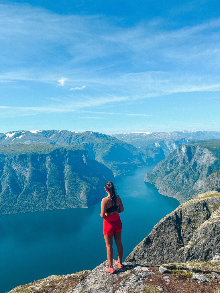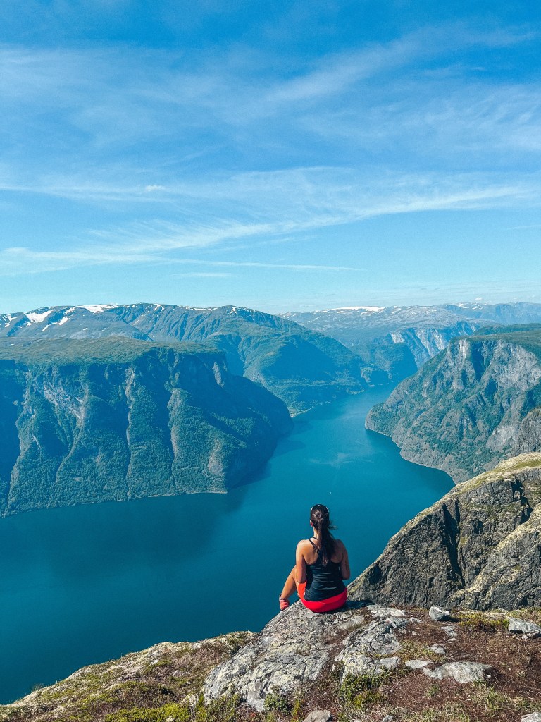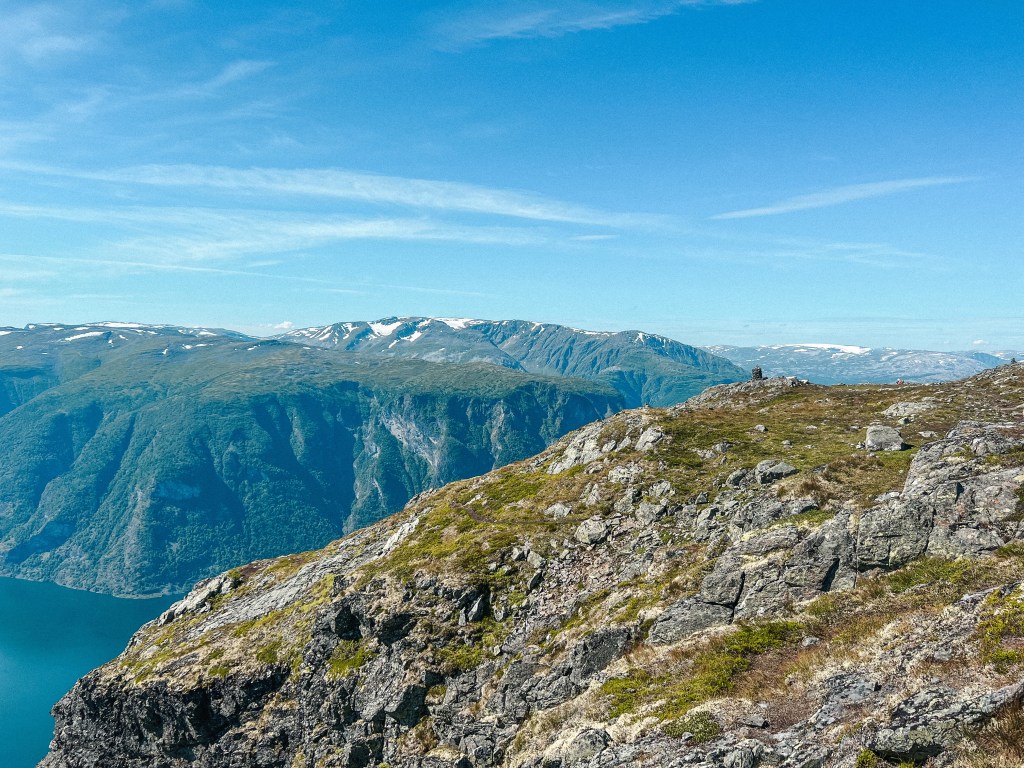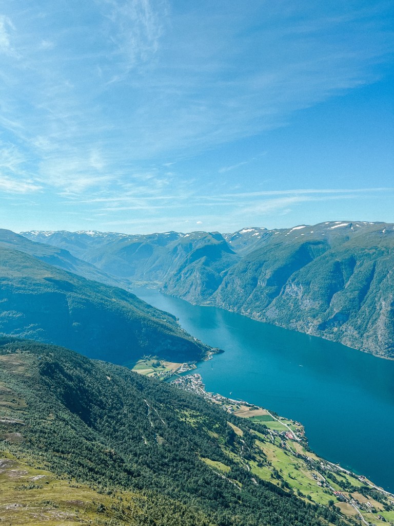 Utsikt ned til Aurland, og innerst i fjorden ligger Flåm.