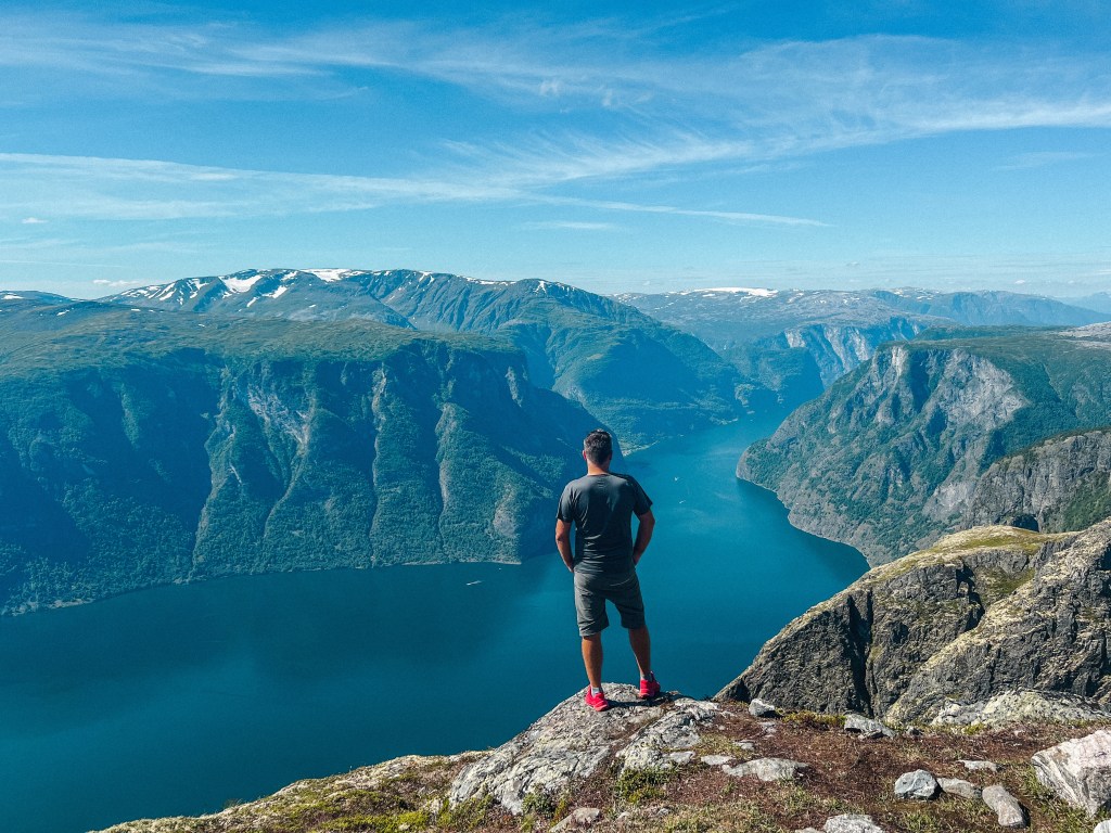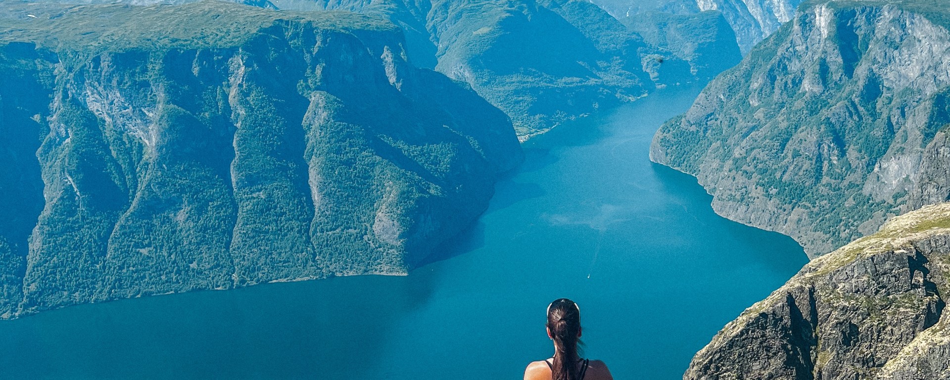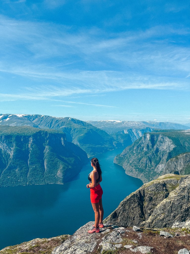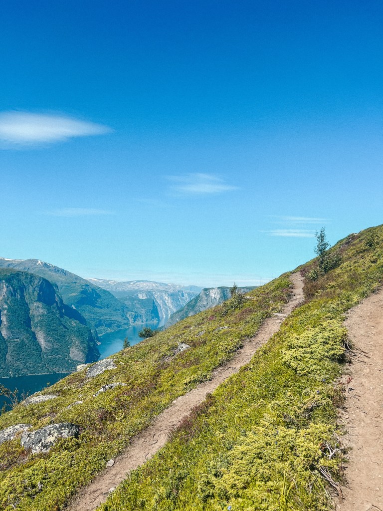 Utsikt ned til Aurland, og innerst i fjorden ligger Flåm.