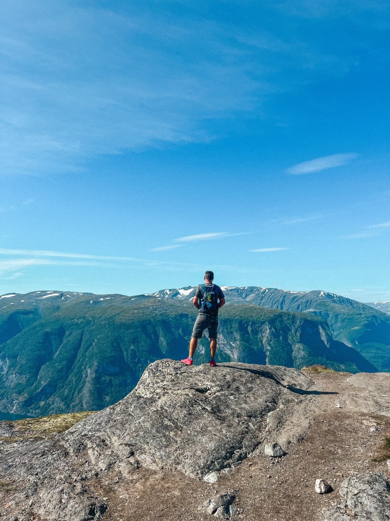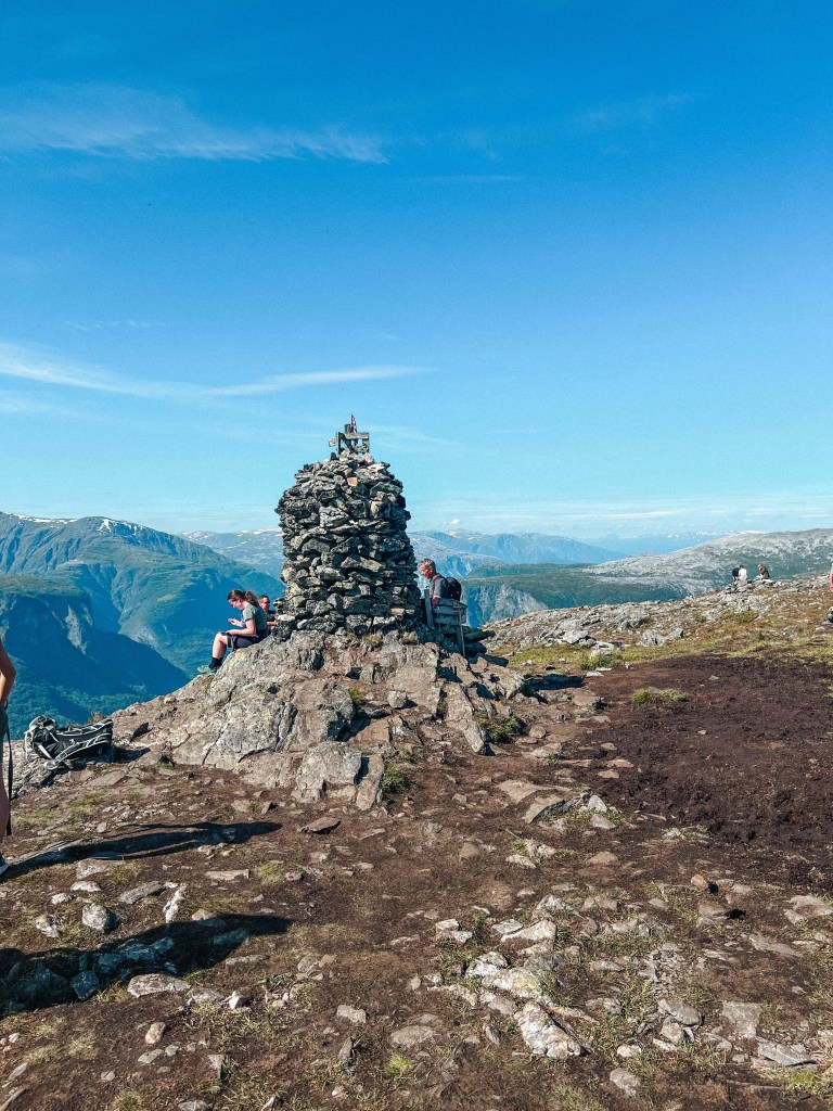 Toppvarden i sikte, straks oppe på Prest. Varden står på 1363 moh, og det er her den beste utsikten over fjorden er. Selve toppen av Prest ligger på 1457 moh, et stykke videre etter varden.