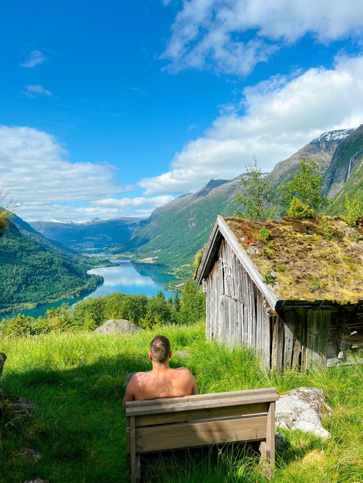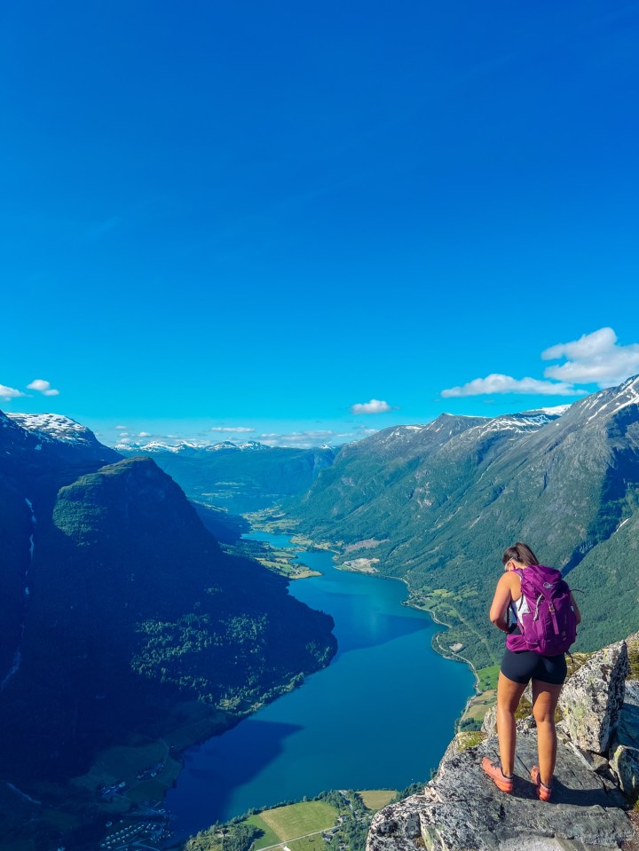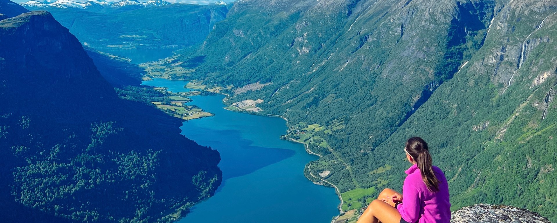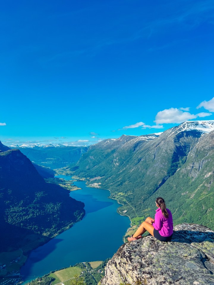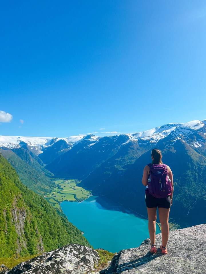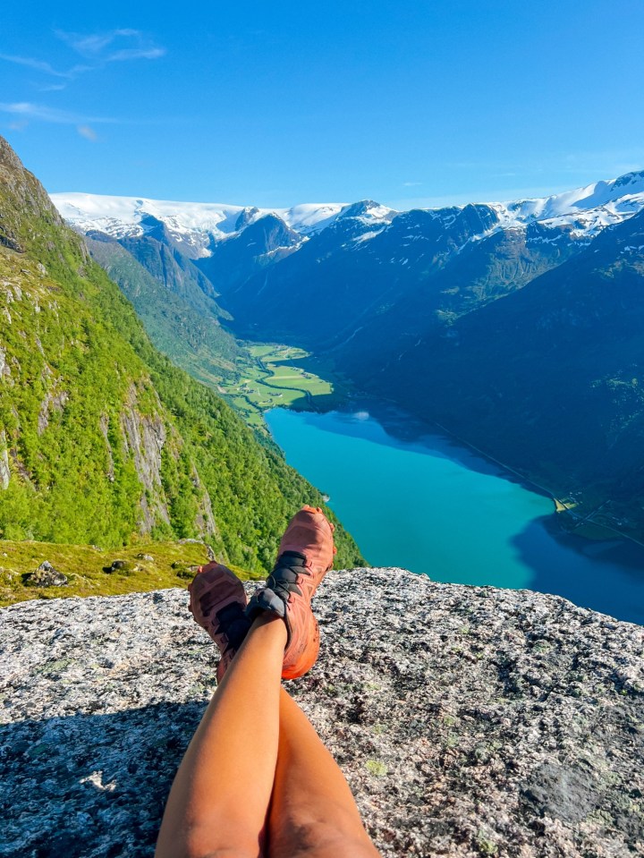 Vell oppe får man en fantastisk utsikt. Toppen er stor så mange plasser å sette seg ned, og man kan se utsikt både oppover Oldedalen og nedover mot Olden og fjorden.