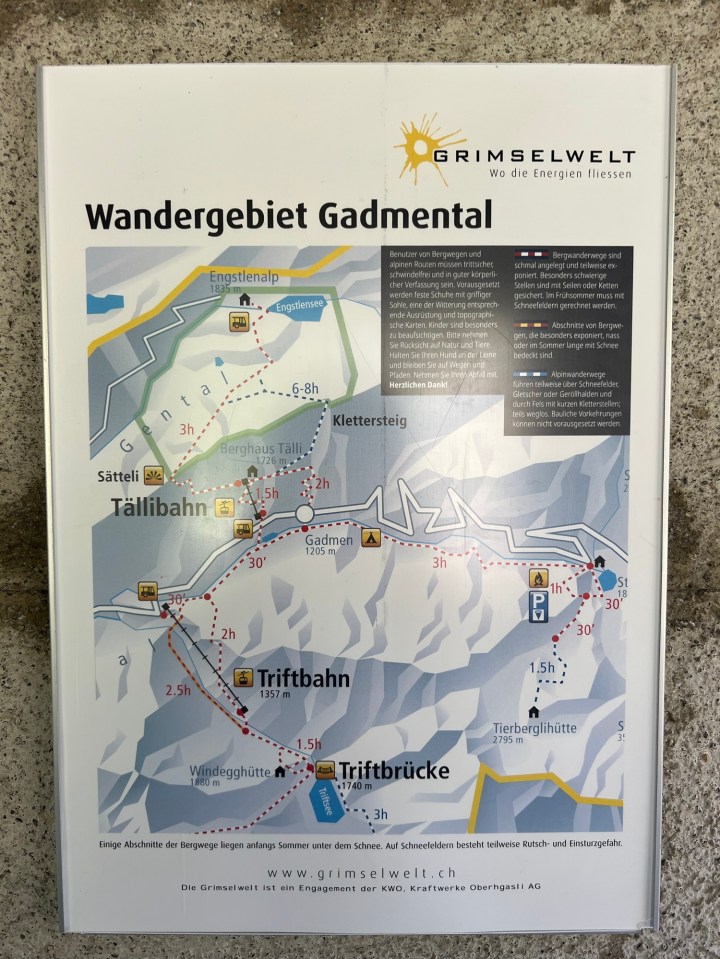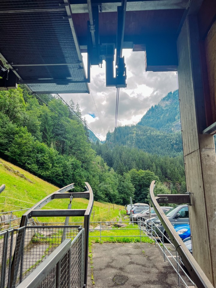 Som mange turer i Sveits så starter turen med en taubane. Vi parkerte ved taubanen Triftbahn og tok den opp til 1357 moh, en tur på ca 10 minutter.