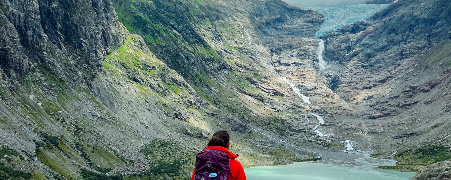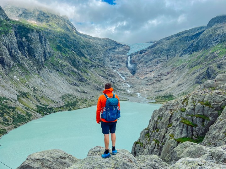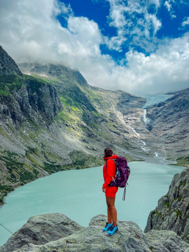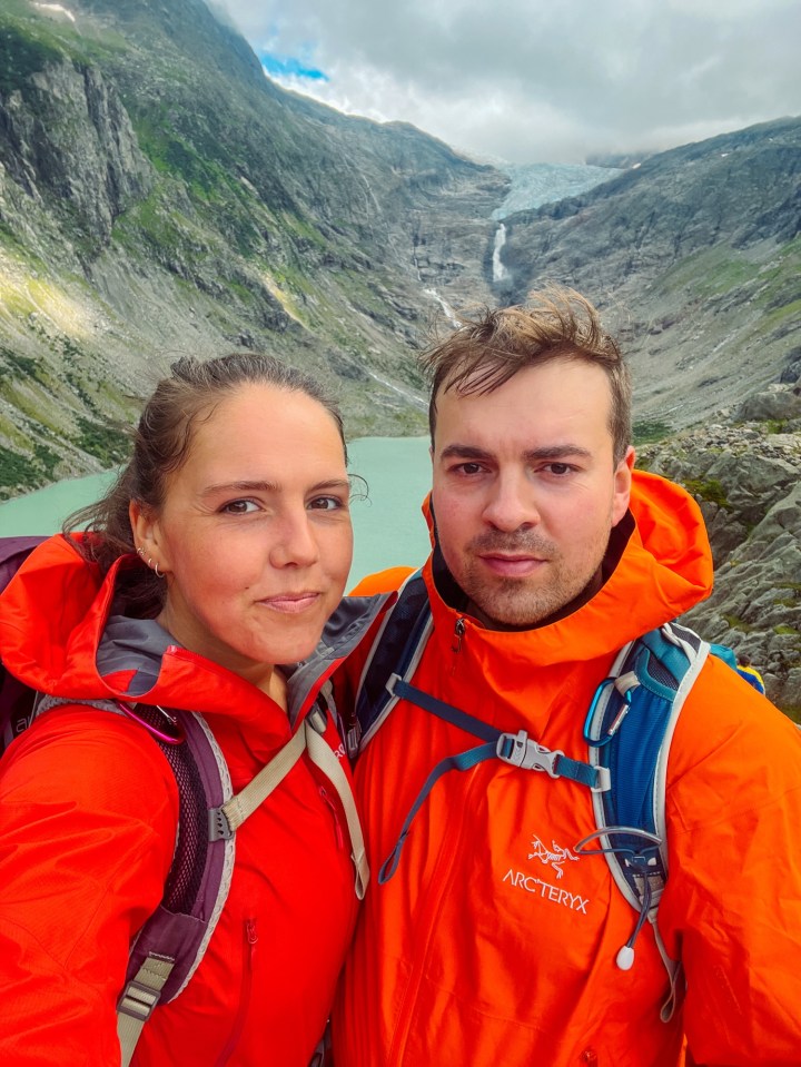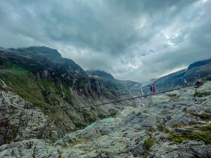 Hengebroen er 100 meter høy og 170 meter lang, og ruver over Triftbreen. Vi måtte ut på og ta litt bilder.