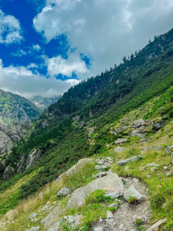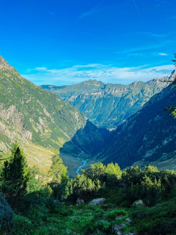 På fjellhyttene i Sveits er det utsjekk kl 8 om morgenen. Vi sto opp til nydelig fint vær, og tok fatt på den ca 2,3 kilometer lange turen ned igjen til taubanen. Ca 50 minutter å gå.