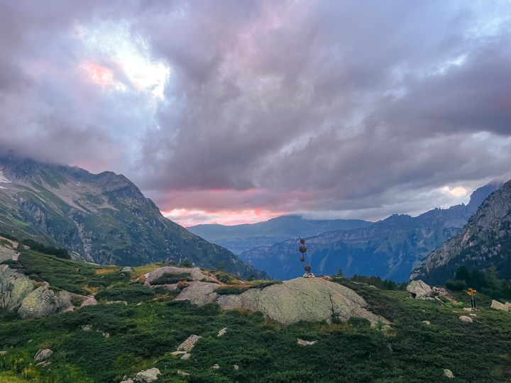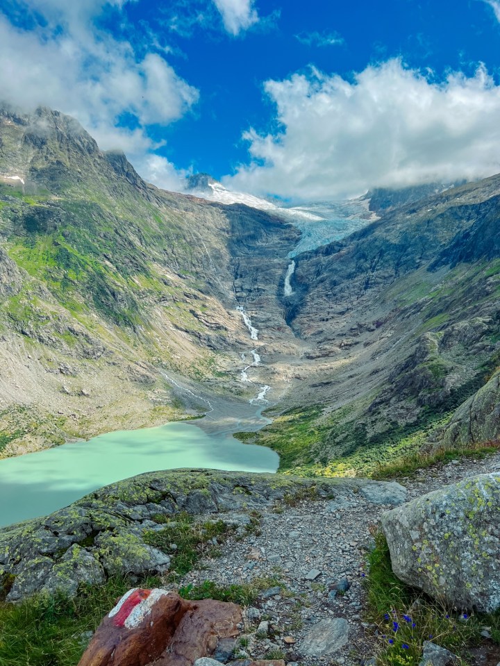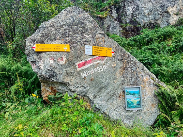 Etter ca 2 km kommer man til denne steinen. Her valgte vi å fortsette fremover til Triftbrücke. Dagen etter når vi skulle ned igjen gikk vi ikke via hengebroen så da kom vi ned fra hytten og til denne steinen.